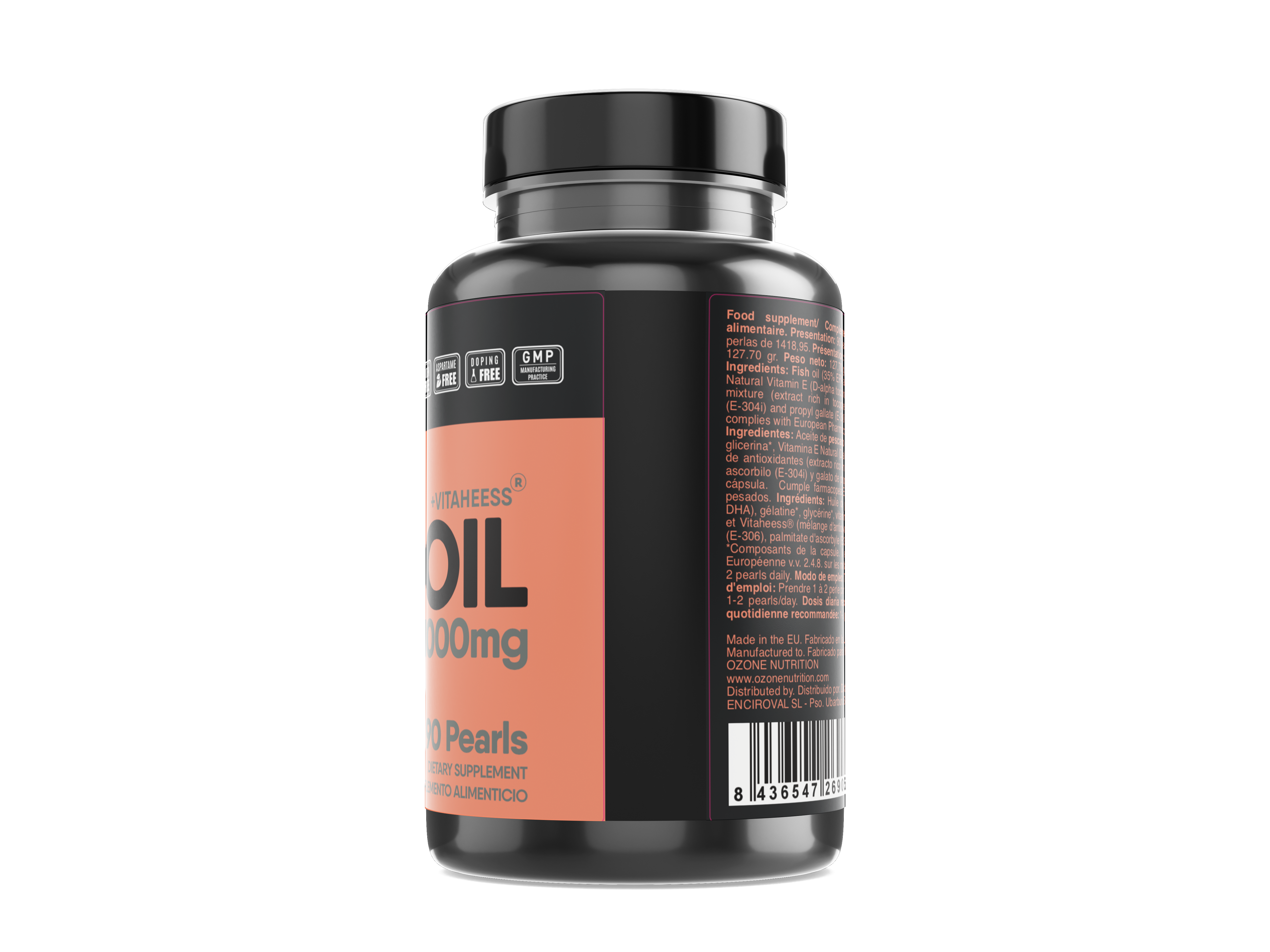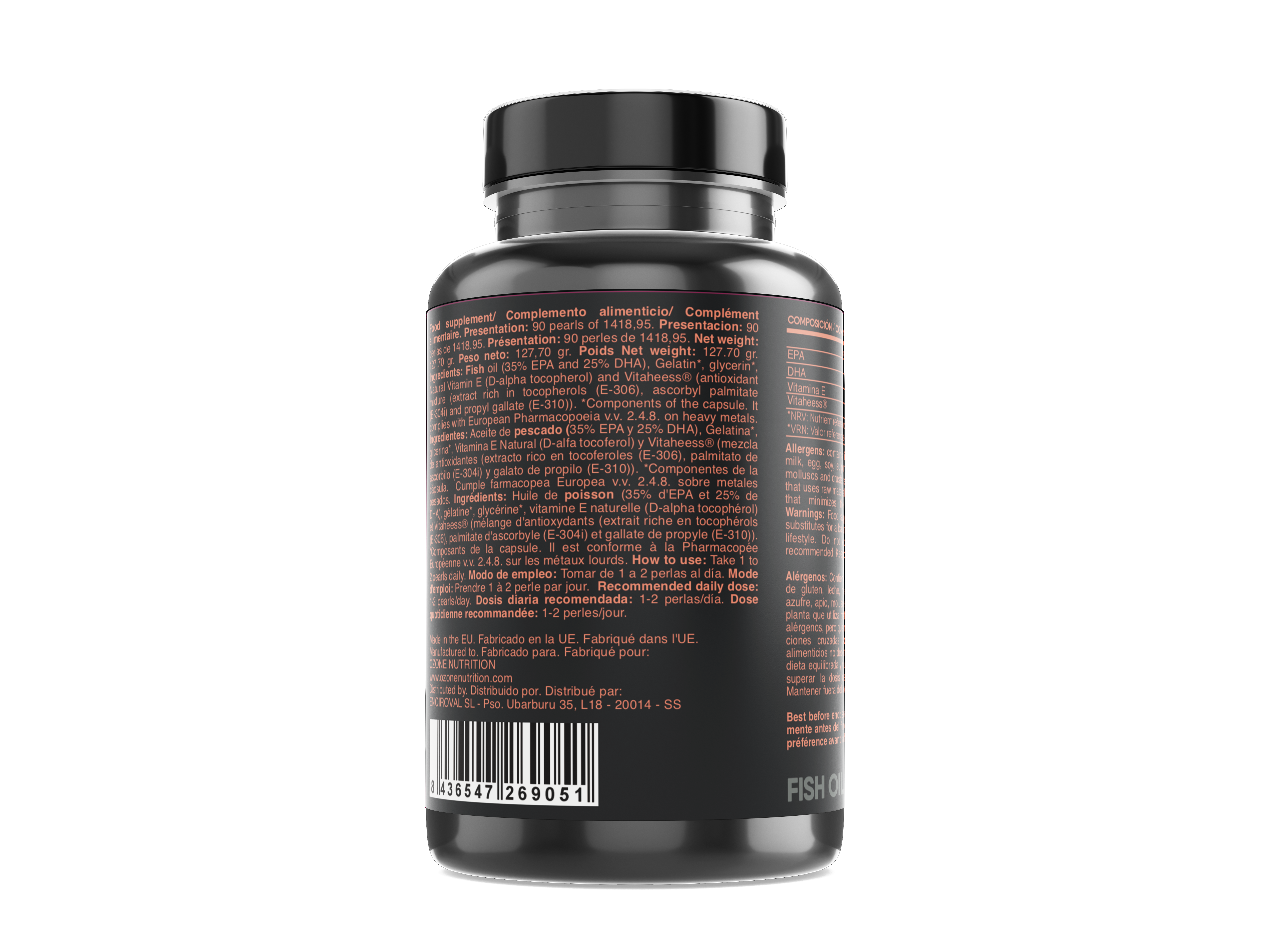 Ingredientes: Aceite de pescado (35% EPA y 25% DHA), Gelatina*, glicerina*, Vitamina E Natural (D-alfa tocoferol) y Vitaheess® (mezcla de antioxidantes (extracto rico en tocoferoles (E-306), palmitato de ascorbilo (E-304i) y galato de propilo (E-310)). *Componentes de la cápsula.