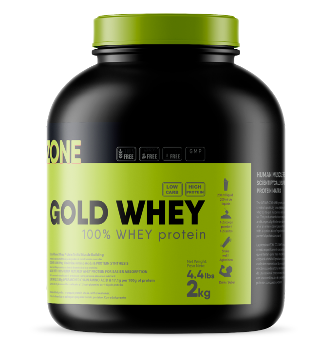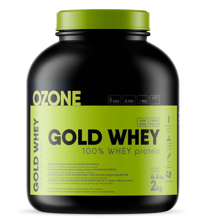 Ozone Gold Whey 2kg. Producto alimenticio en polvo para preparar batido proteico. Con edulcorante.