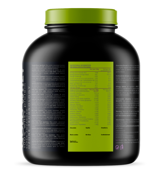 Ingredientes: Concentrado de proteína de suero [contiene emulsionante: lecitina de soja] (leche), maltodextrina, cacao en polvo, aroma de Black Cookies, espesante (goma de celulosa), edulcorante (sucralosa).