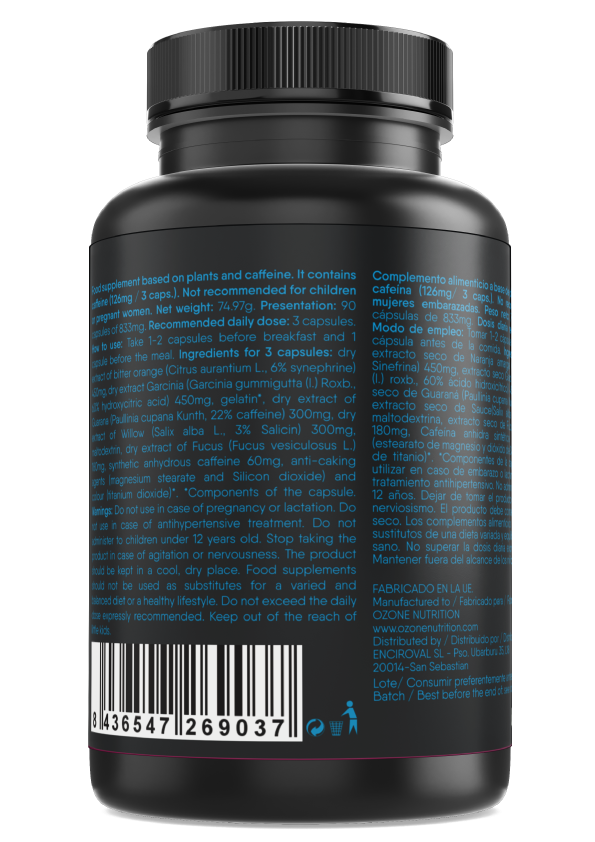 Ingredientes por 3 cápsulas: extracto seco de Naranja amarga (Citrus aurantium L., 6% Sinefrina) 450mg, extracto seco Garcinia (Garcinia gummigutta (l.) roxb., 60% ácido hidroxicítrico) 450mg, gelatina*, extracto seco de Guaraná (Paullinia cupana Kunth, 22% cafeína) 300mg, extracto seco de Sauce(Salix alba L.,3% Salicina) 300mg, maltodextrina, extracto seco de Fucus (Fucus vesiculosus L.) 180mg, Cafeína anhidra sintética 60mg, antiaglomerantes (estearato de magnesio y dióxido de Silicio) y colorante (dióxido de titanio)*. *Componentes de la cápsula.