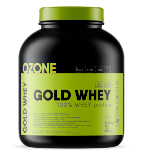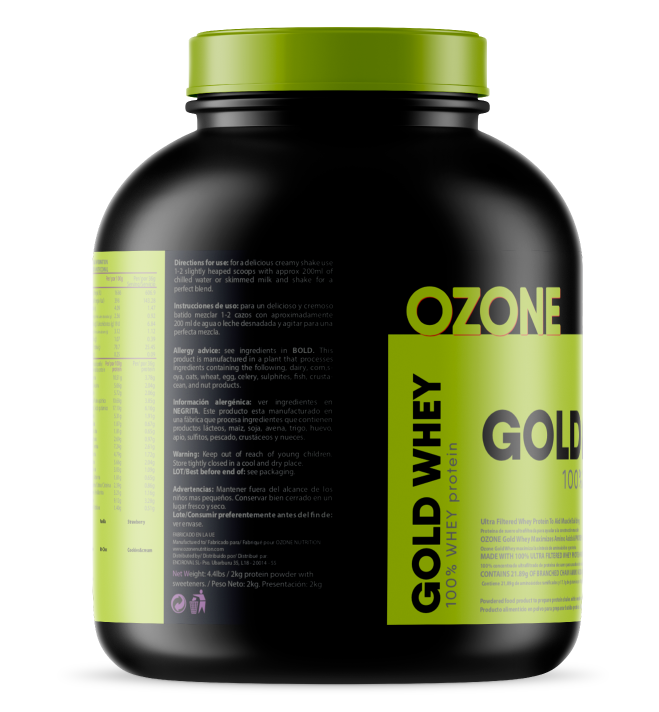 Ozone Gold Whey 2kg. Producto alimenticio en polvo para preparar batido proteico. Con edulcorante.